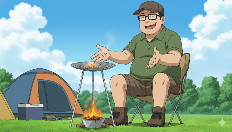 僕は、耐荷重150kgを誇る、頑丈なキャンプチェアを彼のために用意しました。 (それでも彼が座るたび、フレームは「ミシミシ…」「ギギ…」と、恐怖の悲鳴を上げていましたが…笑)