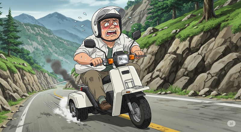 フルスロットルでも、時速45キロが限界。僕たちの後ろには、あっという間に、長い、長い、車の行列ができてしまいました。