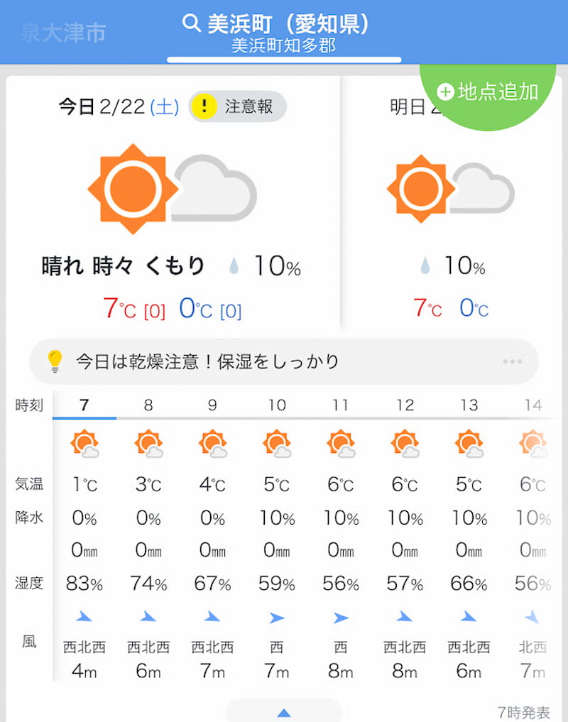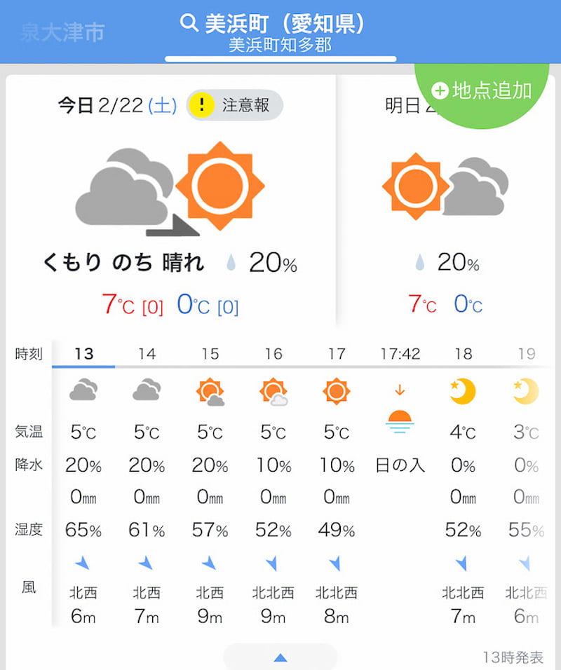 ▼当日の天気予報。時間をずらして保存しているので多少のズレはご容赦を。