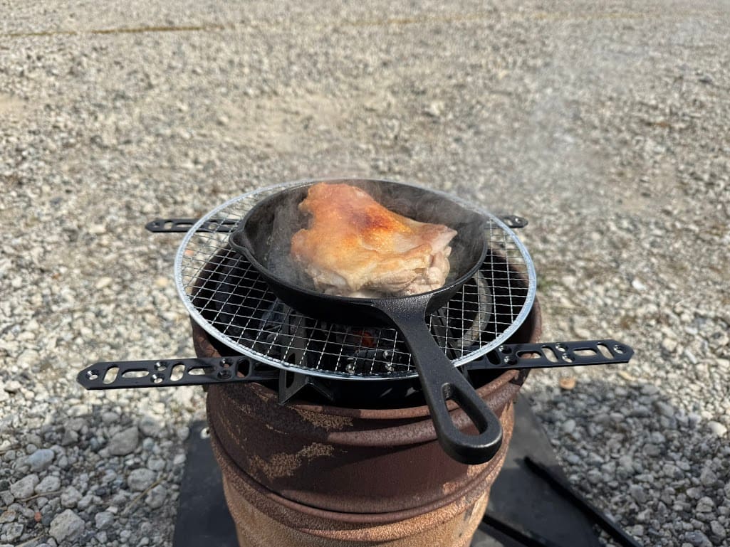 初めてのソロキャンプということもあり、彼のテンションは最高潮。Twitterには、キャンプ場の様子や、調理風景の画像が次々とアップされていきます。その中には、あの伝説の「手作り巨大オイル缶ストーブ」でチキンを焼いている写真もありました。