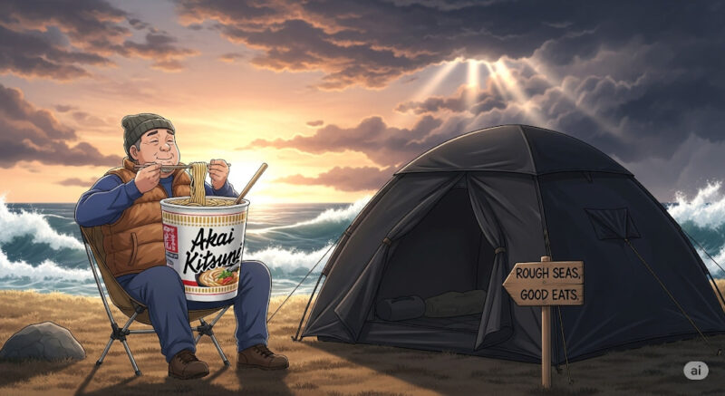 美しい海岸に浮かぶ朝日を眺めながら、彼が朝食に選んだのは、赤いきつね(デカ盛り)。