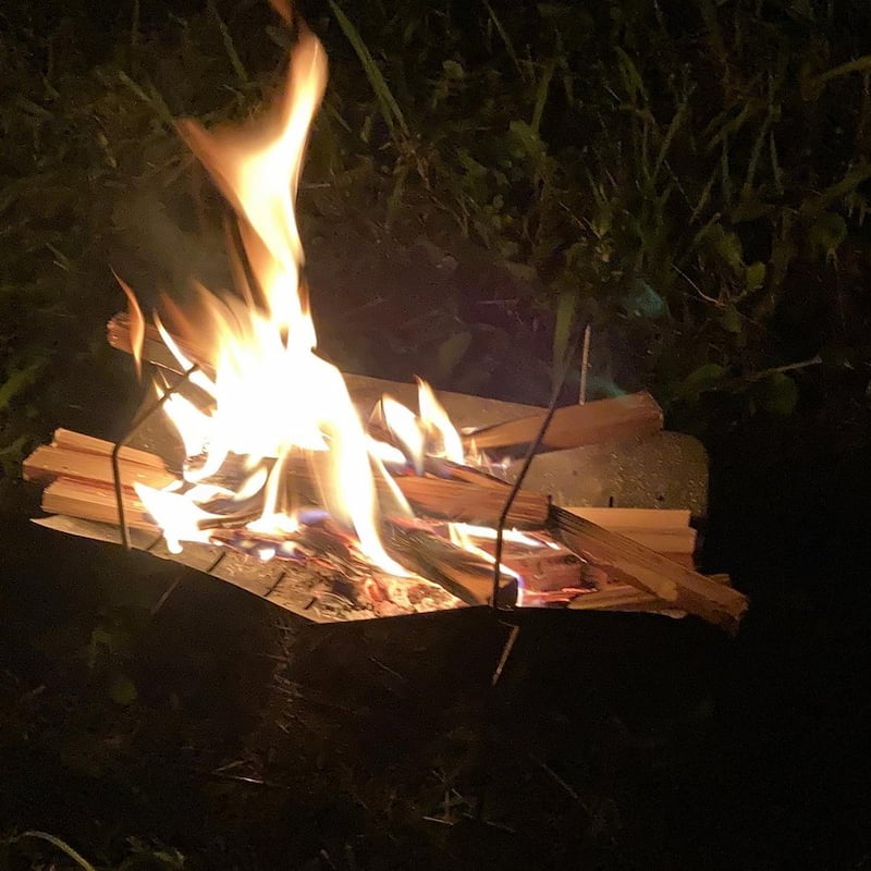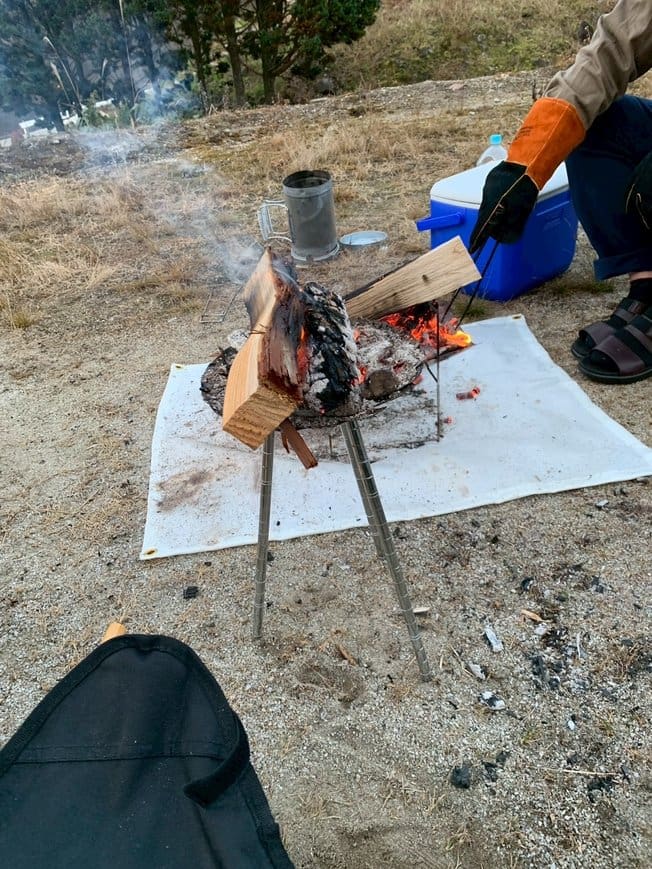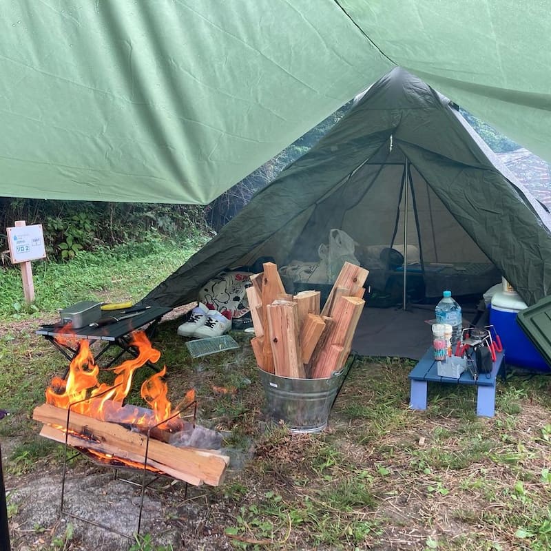 パチパチと薪がはぜる音と、香ばしい煙の匂いで僕は目を覚ましました。テントのジッパーを開けて外に出ると、そこには既に火を起こしているポコさんの姿がありました。