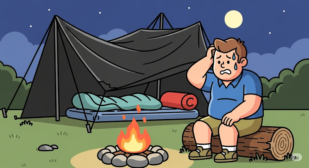 タープは崩壊し、ベッドは空気が抜け、眠れぬ夜を過ごしたはずなのに――彼は笑顔で「楽しかった」と言い切った。