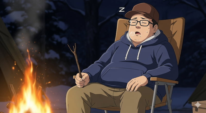 寒空の下、焚き火の前で、無防備に眠る、体重100kg超の巨大な友人。静かなキャンプ場に、彼の、かすかないびきと、燃える焚火の音だけが響いていた。