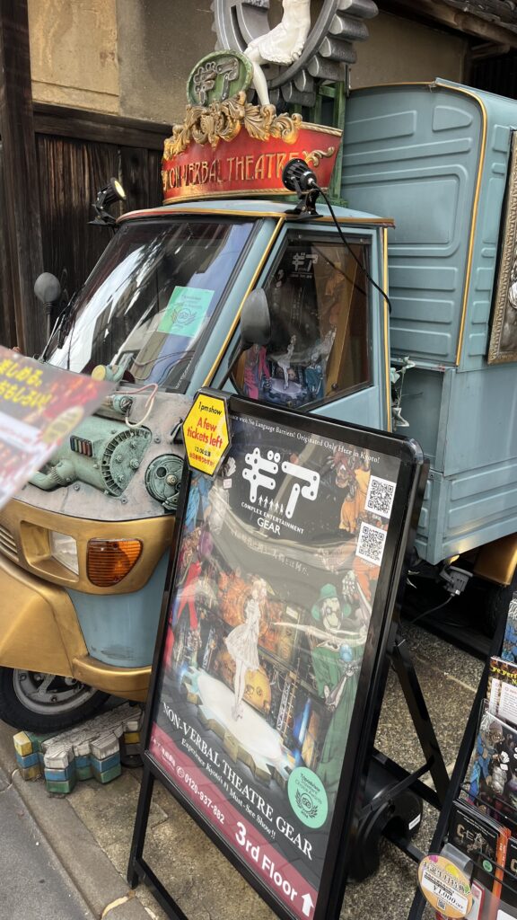 その後は目的の舞台「ギア-GEAR-」へ。言葉を使わないノンバーバルのパフォーマンスに、凝り固まっていた感性が揺さぶられる。ドール役のねこまたさんの演技は可愛らしさと純粋さが際立ち、すっかり魅了された。劇場のショップで僕もマークもお土産を購入。ポコさんはというと、お土産には目もくれず、トイレへ直行。腹具合が悪くトイレにこもりがち――それもまた旅の一コマだ。