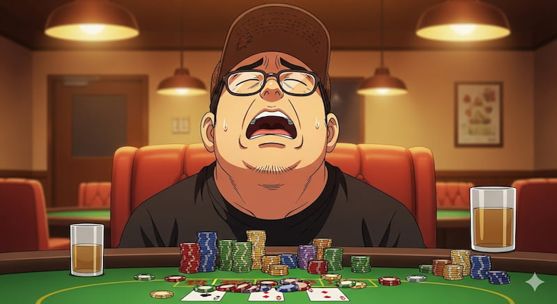 「上級者にはブラフは通じん」「勝てる手以外でオールインするな」って、車の中であれだけ釘を刺したのに…。彼の9000円は数分で消えた。瞬殺劇に、僕はただ肩を落とすしかなかった。